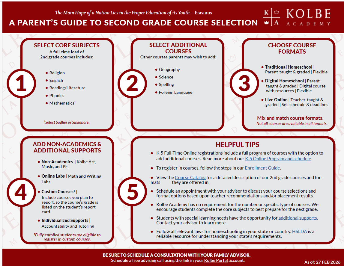 The following guide was created to help you select your child's courses for their Second Grade year. If you have questions about individual courses, please contact your advisor.