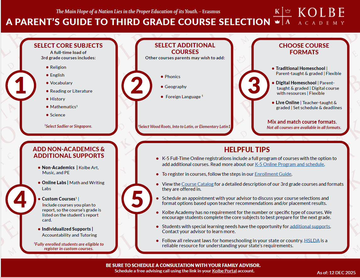The following guide was created to help you select your child's courses for their Third Grade year. If you have questions about individual courses, please contact your advisor.
