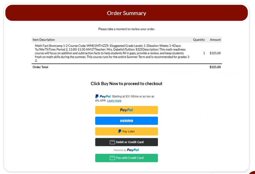 5. You will be prompted for payment after making all of your selections. Please take a moment here to review the summary of your selections before finalizing the checkout process: