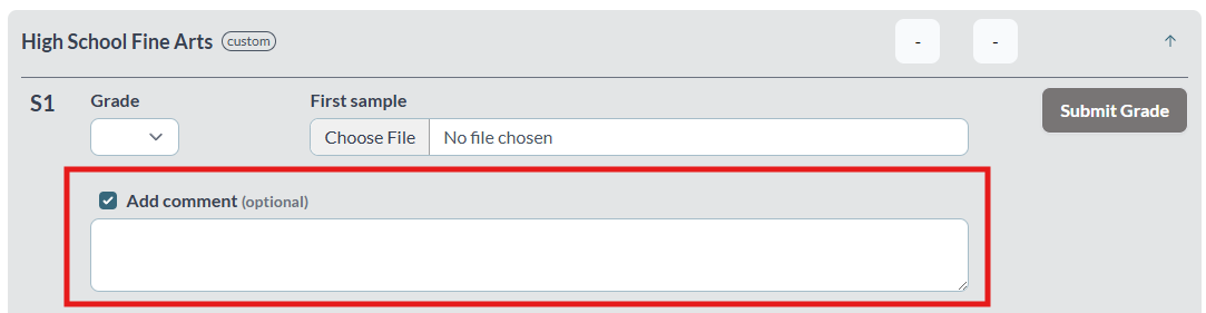 If you notice a custom course does not have an updated custom course title, you can continue to submit the recommended grade and sample work in the Portal. After submission, our team will update the course title based upon the course title approved by your advisor at the time of your custom course review. If you'd prefer to replace the "Fine Arts" course title with either Art or Music, please indicate this preference in the Add comment box as shown below. Our team will review your request and make the requested change if appropriate to the activity completed.